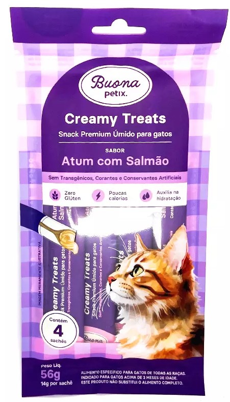 A Buona Petix Creamy Atum com Salmão é um petisco cremoso especialmente desenvolvido para gatos adultos, com uma combinação irresistível de sabores e ingredientes de alta qualidade. Feita com atum, salmão e frango, sua fórmula garante muito sabor e uma textura que os felinos adoram, podendo ser servida diretamente do sachê ou usada para incrementar a refeição.