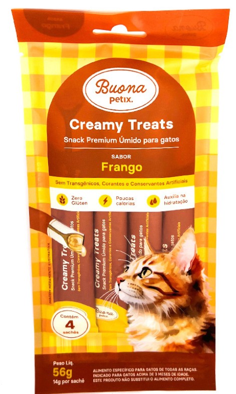 A Buona Petix Creamy Frango é um petisco cremoso especialmente desenvolvido para gatos adultos, com sabor irresistível e textura suave, perfeita para agradar até os felinos mais exigentes.