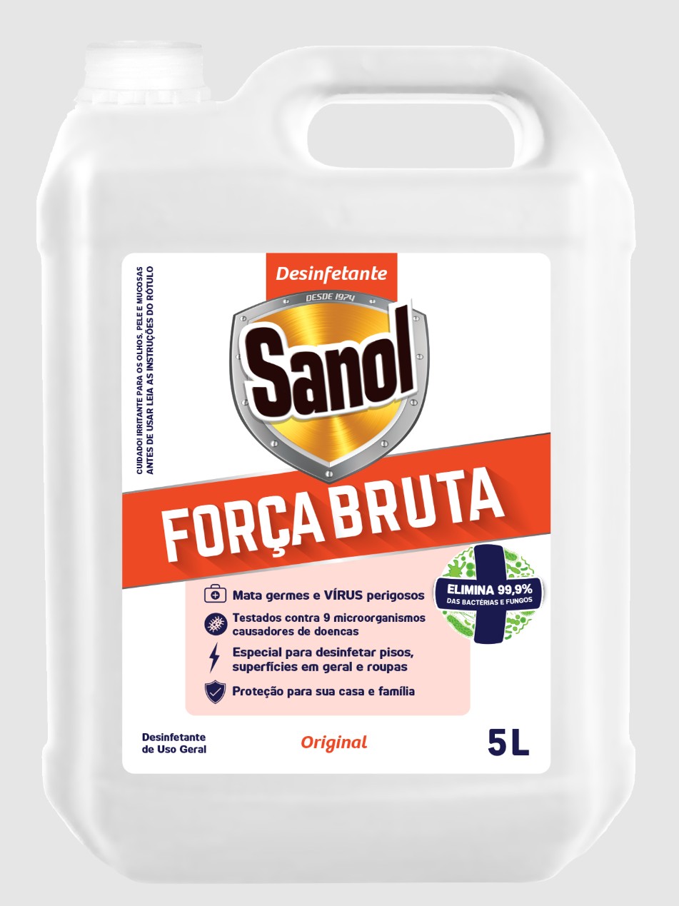 O Sanol Força Bruta Original 5L é um desinfetante bactericida de alta potência, desenvolvido para limpeza pesada e desinfecção profunda de pisos, superfícies e ambientes em geral. Sua fórmula concentrada elimina 99,9% de bactérias, germes, fungos e vírus, incluindo Influenza (H1N1) e Coronavírus, garantindo maior proteção para a casa e a família.