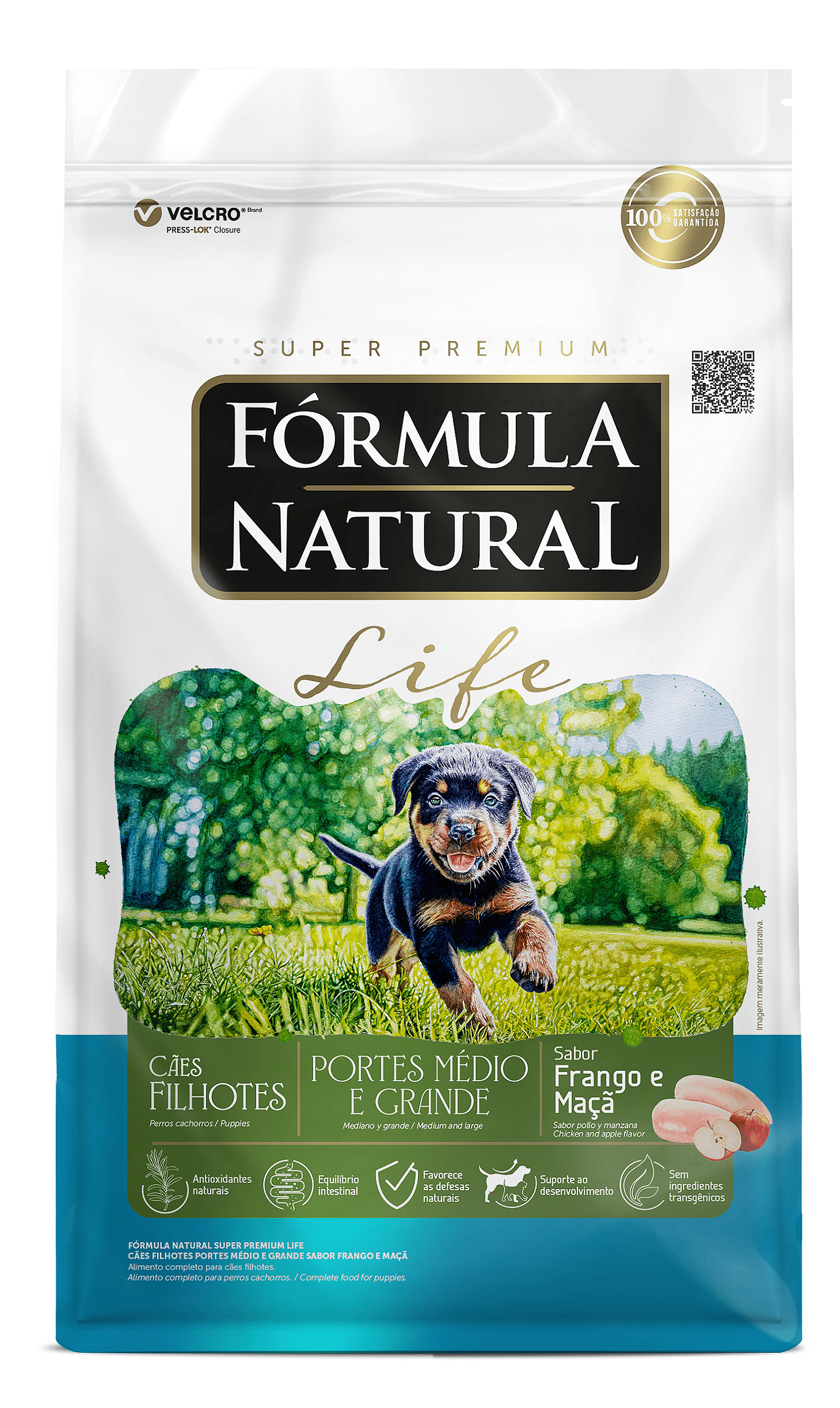 Fórmula Natural Super Premium Cães Filhotes Portes Médio e Grande oferece todos os cuidados para um ótimo desenvolvimento dos cães filhotes de porte médio e grande, do desmame até 18 meses de idade.