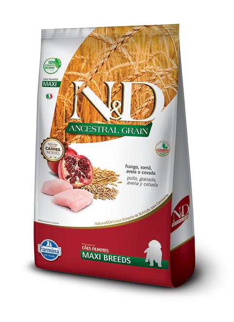 A N&D Ancestral Frango e Romã Puppy Maxi é uma ração seca super premium formulada para cães filhotes de raças grandes e gigantes, além de também ser indicada para cadelas no terço final da gestação e em lactação.