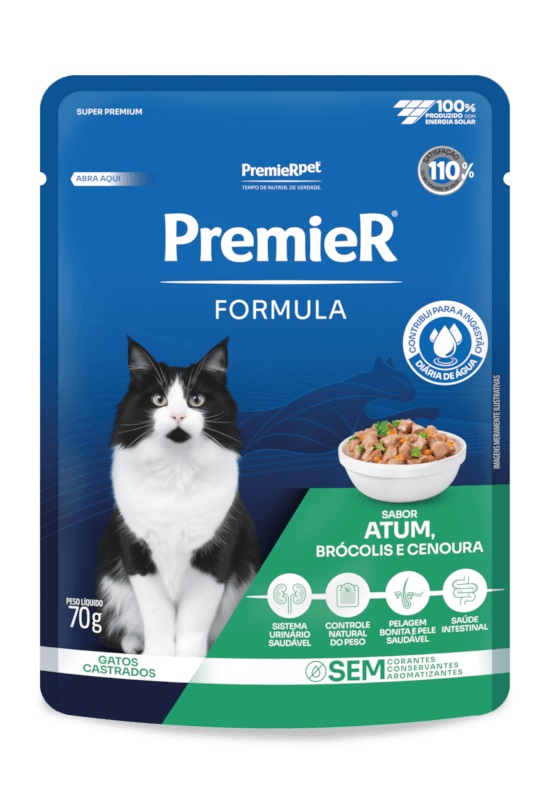 PremieR® Formula Úmido Gatos Adultos Castrados Atum 70 g é um alimento super premium, completo e balanceado,especialmente elaborado para os felinos.